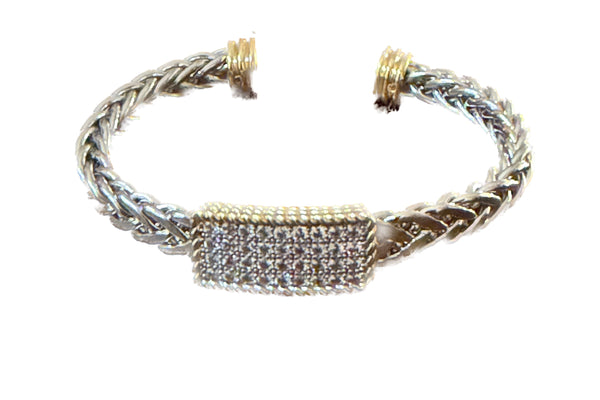 Elevate your everyday style with this striking braided cable wire bracelet, featuring a rectangular pavé accent bar that catches the light beautifully. The intricate braided design offers modern sophistication, while the sparkling pavé detailing adds just the right amount of glamour. Perfect for stacking or wearing solo, this versatile piece transitions seamlessly from casual to elegant occasions. A must-have accessory that combines contemporary flair with timeless appeal.