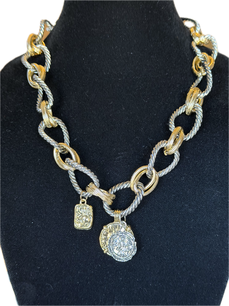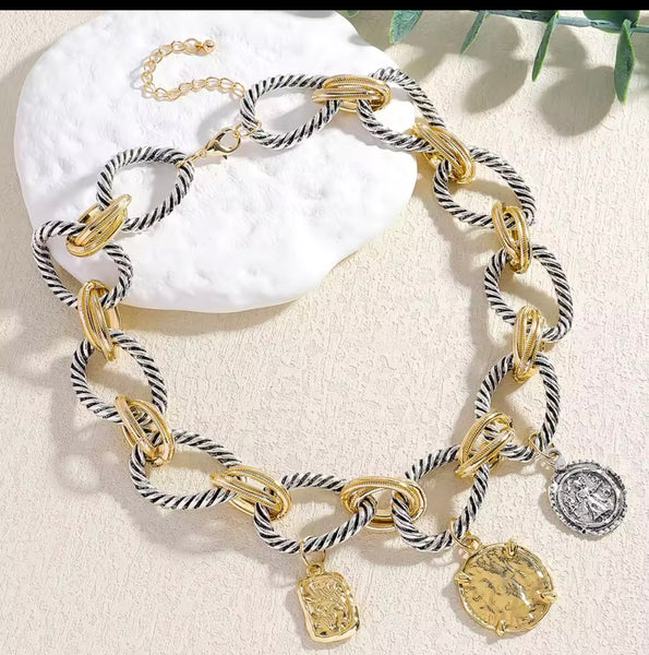 Make a bold statement with this striking chain link necklace, where gleaming coin pendants catch the light with every movement. The layered metallic design combines contemporary edge with timeless elegance, creating an instantly elevated look that transitions seamlessly from day to night. This piece commands attention while maintaining sophisticated restraint.